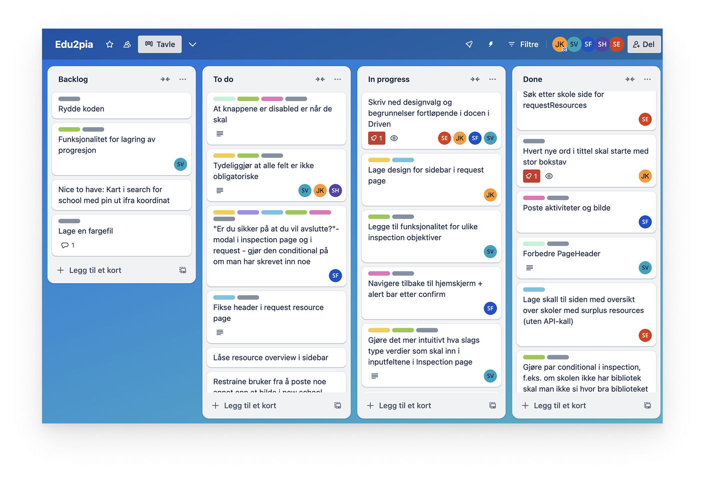 Prosjektet gikk over 6 uker, og vi jobbet i et tverrfaglig team med en smidig og iterativ tilnærming. Vi organiserte arbeidet med et kanban-board, hadde daglige start-ups og gjennomførte retrospektiver for å holde hverandre oppdatert og kunne jobbe tett. Rollen som Scrum Master ble rullert slik at alle fikk erfaring med å lede prosessen.